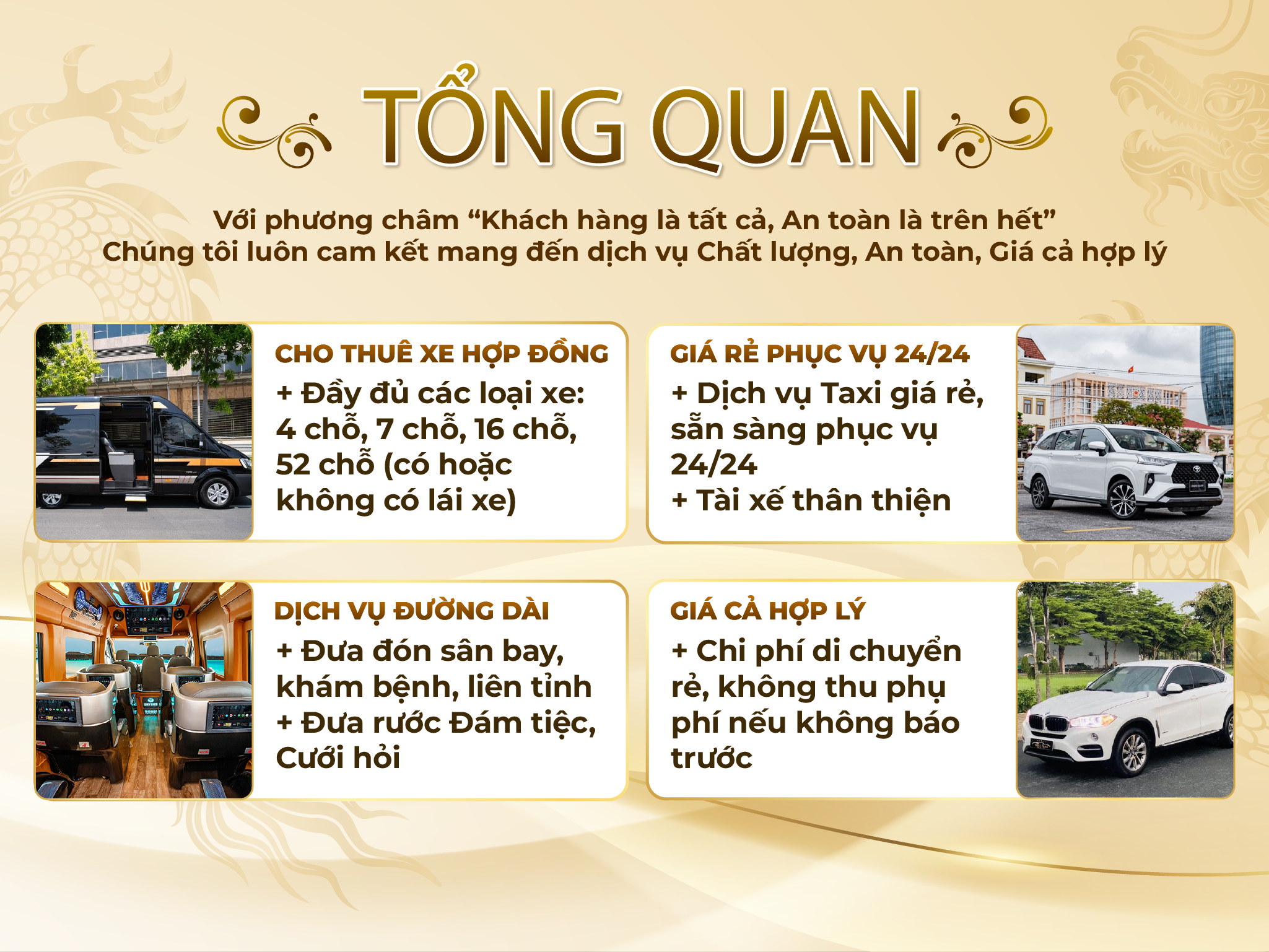 Số lượng xe đa dạng, 4 chỗ đến 45 chỗ, xe đời mới hiện đại, tiện nghi, sạch sẽ